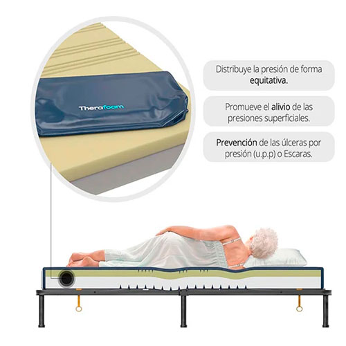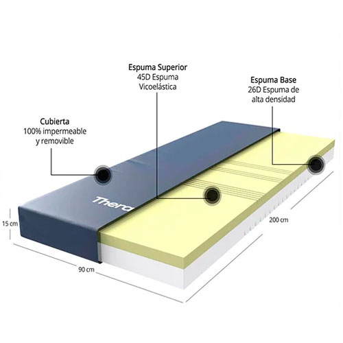 El Colchón Viscoelástico Therafoam Theramart es la solución ideal para prevenir escaras y úlceras por presión en pacientes con movilidad reducida o en proceso de recuperación.